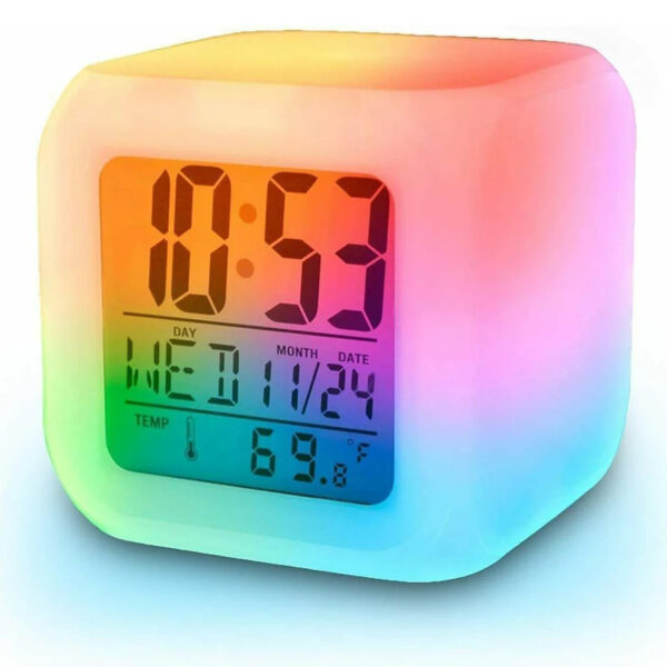 | Color – White, Display Type – Digital, Special Feature – Alarm with 7 color led, Product Dimensions – 7.5W x 7.5H Centimeters, Power Source – Battery Powered, Room Type – Home Office, Shape – Cube |